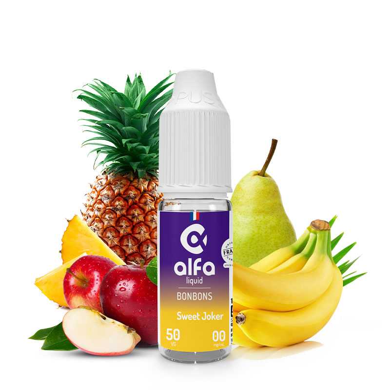 Connaissez-vous ce clown aux cheveux verts ? Le e-liquide Sweet Joker issu de la gamme Alfaliquid 50/50 est un juice à l’effigie de ce personnage de cinéma iconique. Surtout connu pour son côté fou et imprévisible, il a inspiré les chimistes de la marque ce qui a valu un e-liquide fruité tout aussi déjanté. Fait à base de banane, d’ananas, de poire, de pomme, ce tutti frutti vous assurera d’énormes explosions de saveur en bouche.