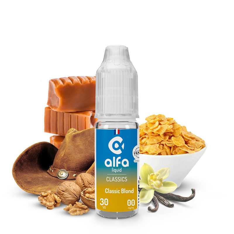 On ne peut qu’être comblé de bonheur devant le e-liquide Classic Blond proposé par la gamme Alfaliquid Original 70/30 de la marque française Alfaliquid. Cet e-liquide est un must have pour tous les vapoteurs qui cherchent à oublier le tabac. En optant pour ce classic gourmand, vous obtiendrez une agréable vapeur aux arômes de céréales et de noix. Avant de ressentir les saveurs de vanille et de caramel à l'expiration.