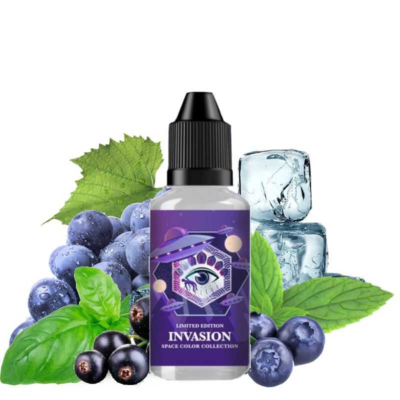 Le Invasion est un concentré DIY de la gamme Space Color. Cette recette à base de myrtilles et de menthe basilic se présente sous sa plus belle forme, avec des notes de cassis et de raisin noir pour un rendu fruité et rafraîchissant inattendu. Ce cocktail fruité fait la part belle à un vent de fraîcheur glacé pour une expérience gustative sans faille !