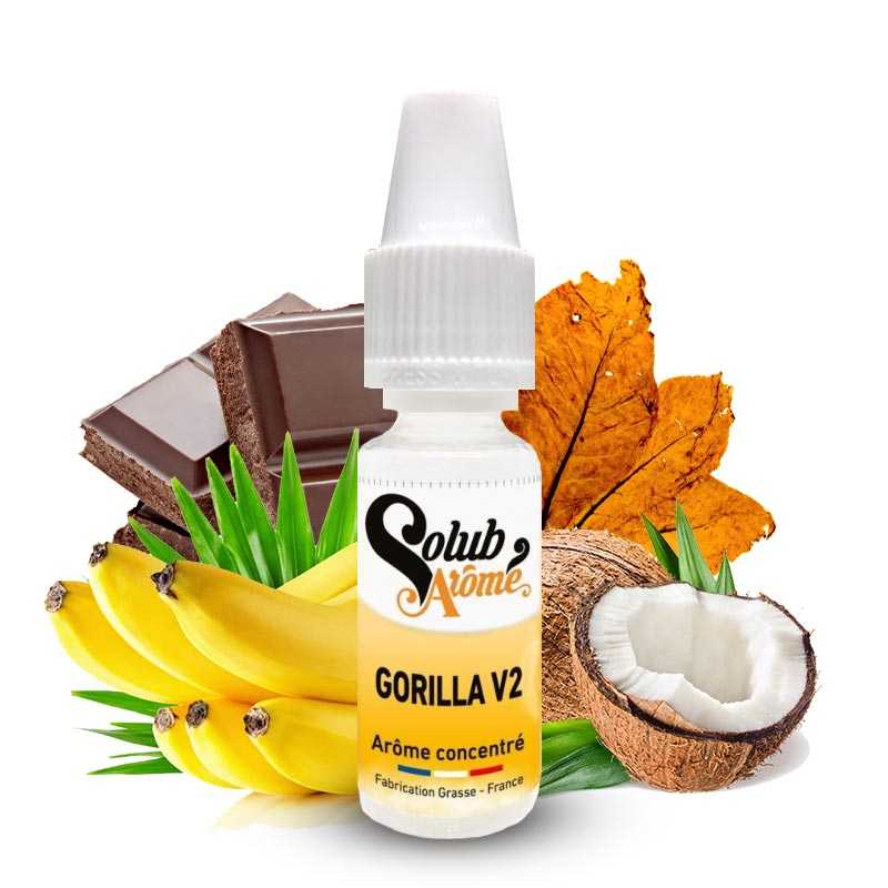 Apportez une petite ambiance fruitée à vos séances de vapotage en ajoutant à vos recettes d’e-liquide DIY l’arôme concentré Gorilla V2 proposé par Solubarome. Ce concentré est une revisite du fameux Gorilla, ce bon classique type américain au délicieux goût de banane. Toujours riche en saveur de banane, il vous fera profiter du goût doux et sucré de ce fruit à tout moment de la journée. Si vous êtes un adepte de classic fruité, vous risquez de ne jamais vous en lasser !