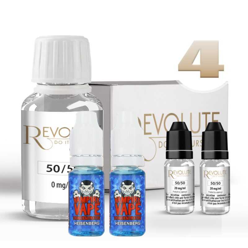Pack DIY Heisenberg 120ml conçu pour réaliser votre mélange simplement. Ce pack est composé de 2 concentrés Heisenberg 10ml de Vampire Vape et d'un Pack DIY 50/50 100ml de Revolute contenant de la base neutre et des boosters de nicotine.