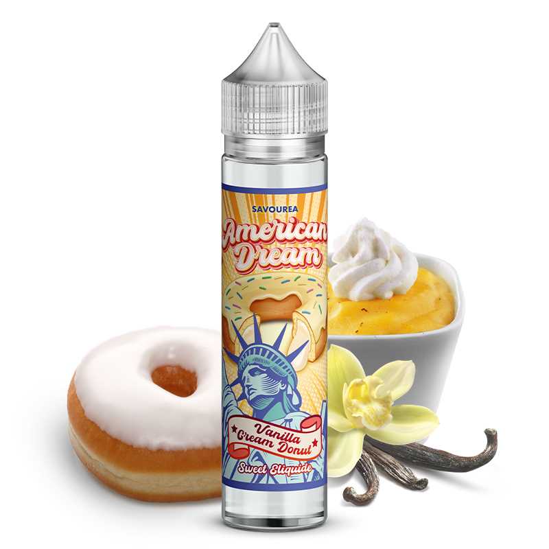 L’oncle Sam vous tend les bras à travers l'e-liquide Vanilla Cream Donut issu de la gamme American Dream ! Vous l’aurez compris, cet e-liquide vous invite à déguster une spécialité typiquement américaine. Fondez de plaisir à tout moment en savourant un somptueux donut généreusement fourré avec de la crème à la vanille. Croustillant à l’extérieur, moelleux à l’intérieur, cette nouvelle gourmandise a de quoi faire saliver les vapoteurs les plus exigeants !