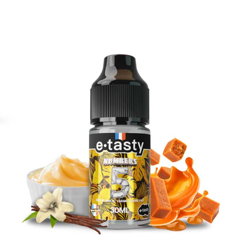 Les vapoteurs souhaitant concocter leur propre élixir gustatif peuvent opter pour le Numbers 5 d’E-Tasty de la gamme Concentrés Numbers. Il vous plonge dans un univers gourmand avec la richesse du caramel au beurre salé, associé à la crémeuse de la custard et à l’onctuosité de la vanille. Un mélange savant promettant des moments de vape intenses. En effet, cette création DIY est un véritable délice offrant la possibilité aux vapoteurs d’ajuster la quantité d’arôme de leur choix pour une expérience personnalisée.