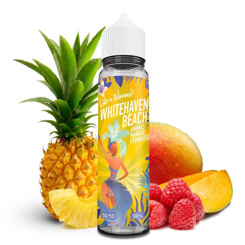 Whitehaven Beach 50 ml révèle un savoureux cocktail à base de mangue juteuse, d'ananas frais et acidulé ainsi qu'une framboise gourmande et sucrée pour un taux PG/VG de 50/50 ;