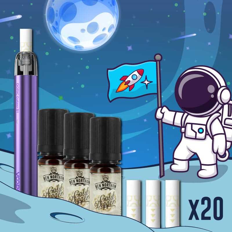 Découvrez notre pack débutant qui seral idéal pour arrêter de fumer grâce à une transition en docueur de la cigarette à la cigarette électronique grâce au Pod Doric Galaxy S1 accompagné de ses 20 filtres et de 3 fioles d'eliquides Gold Digger de Ben Northon :