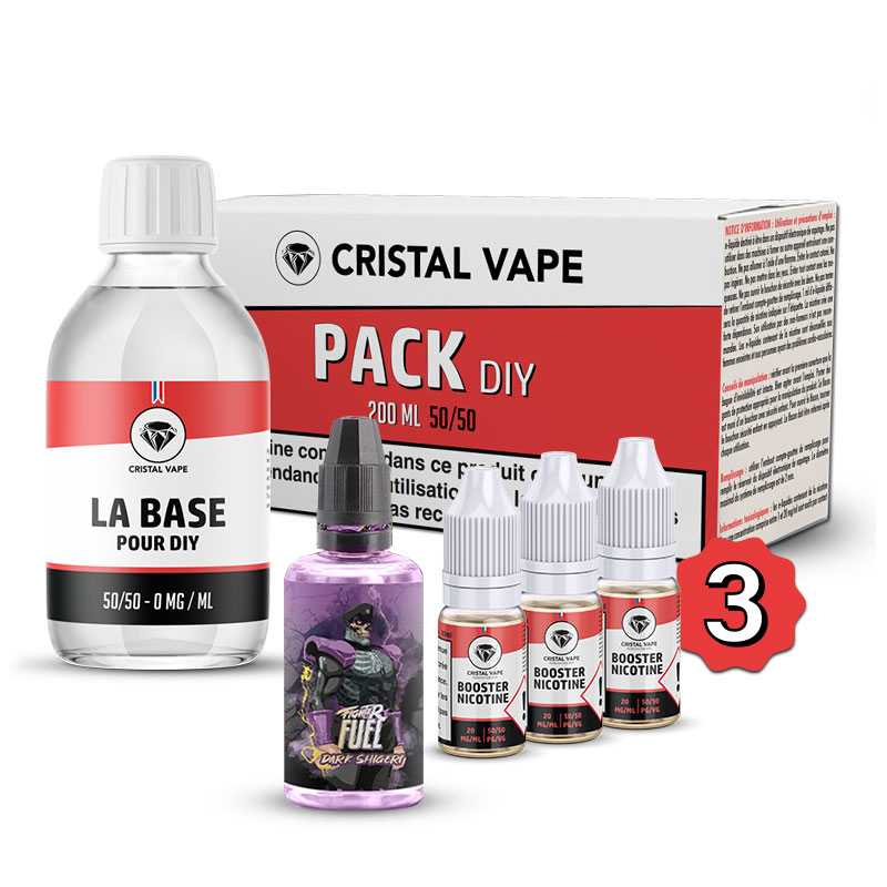 Pack DIY Dark Shigeri 230ml conçu pour réaliser votre mélange simplement. Ce pack est composé du concentré Dark Shigeri 30ml de Fighter Fuel et d'un Pack DIY 50/50 200ml de Cristal Vape contenant de la base neutre et des boosters de nicotine.